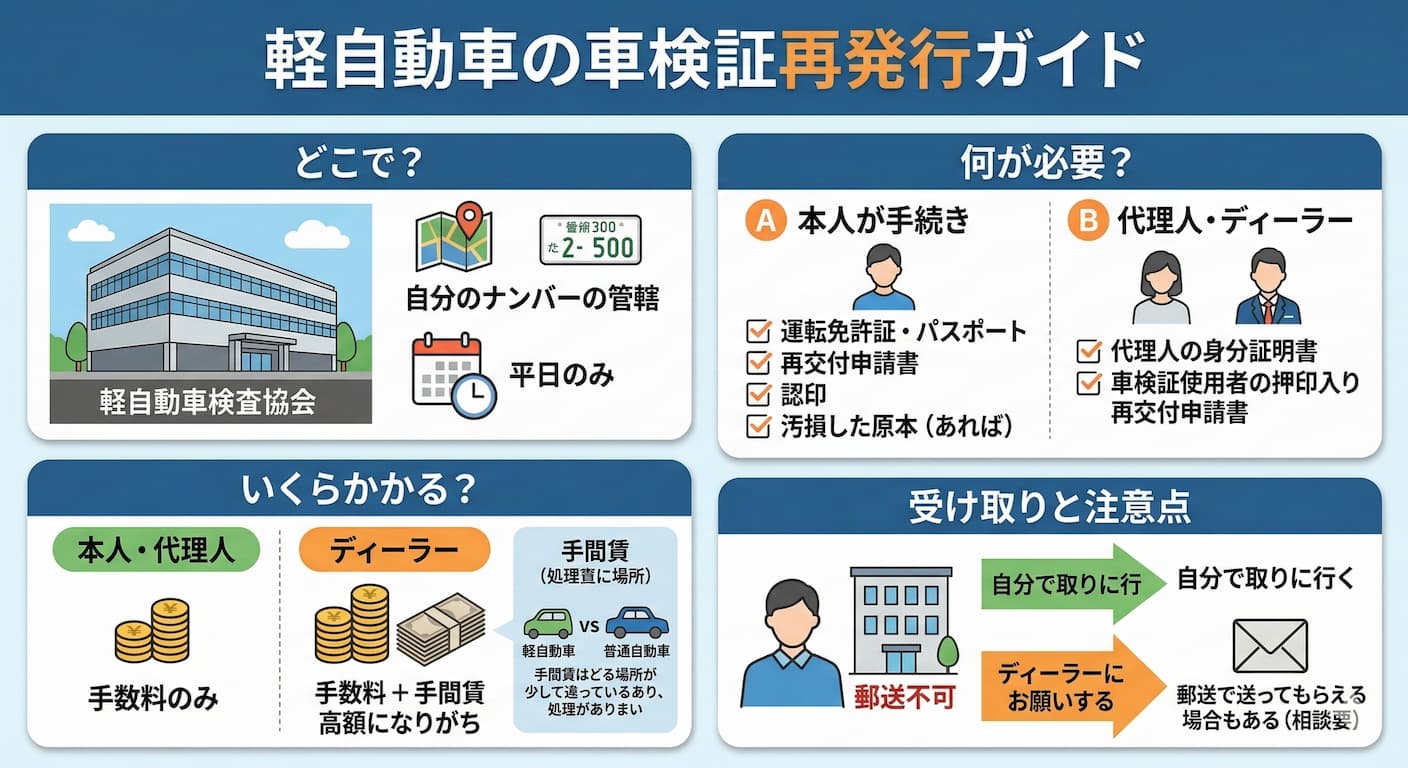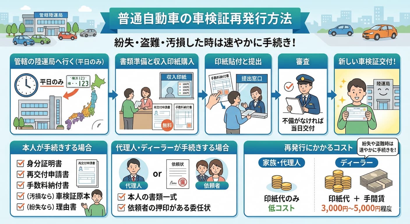 納税証明書を紛失してしまった場合でも、適切な手続きを行えば再発行が可能です。車検をスムーズに進めるためにも、再発行の手順をしっかり把握しておきましょう。ここでは、再発行の場所、必要な書類、かかる日数や手数料について詳しく解説します。