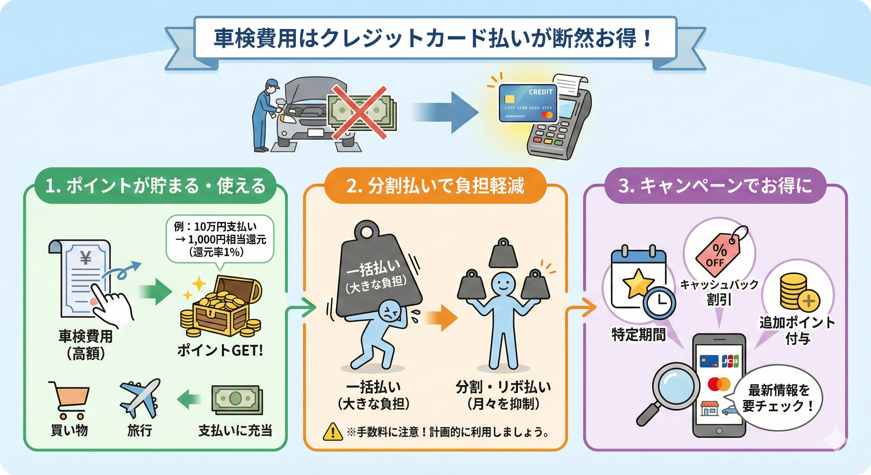 この記事が、あなたの車検費用支払いの選択肢を広げ、賢く車検を乗り切る一助となれば幸いです。