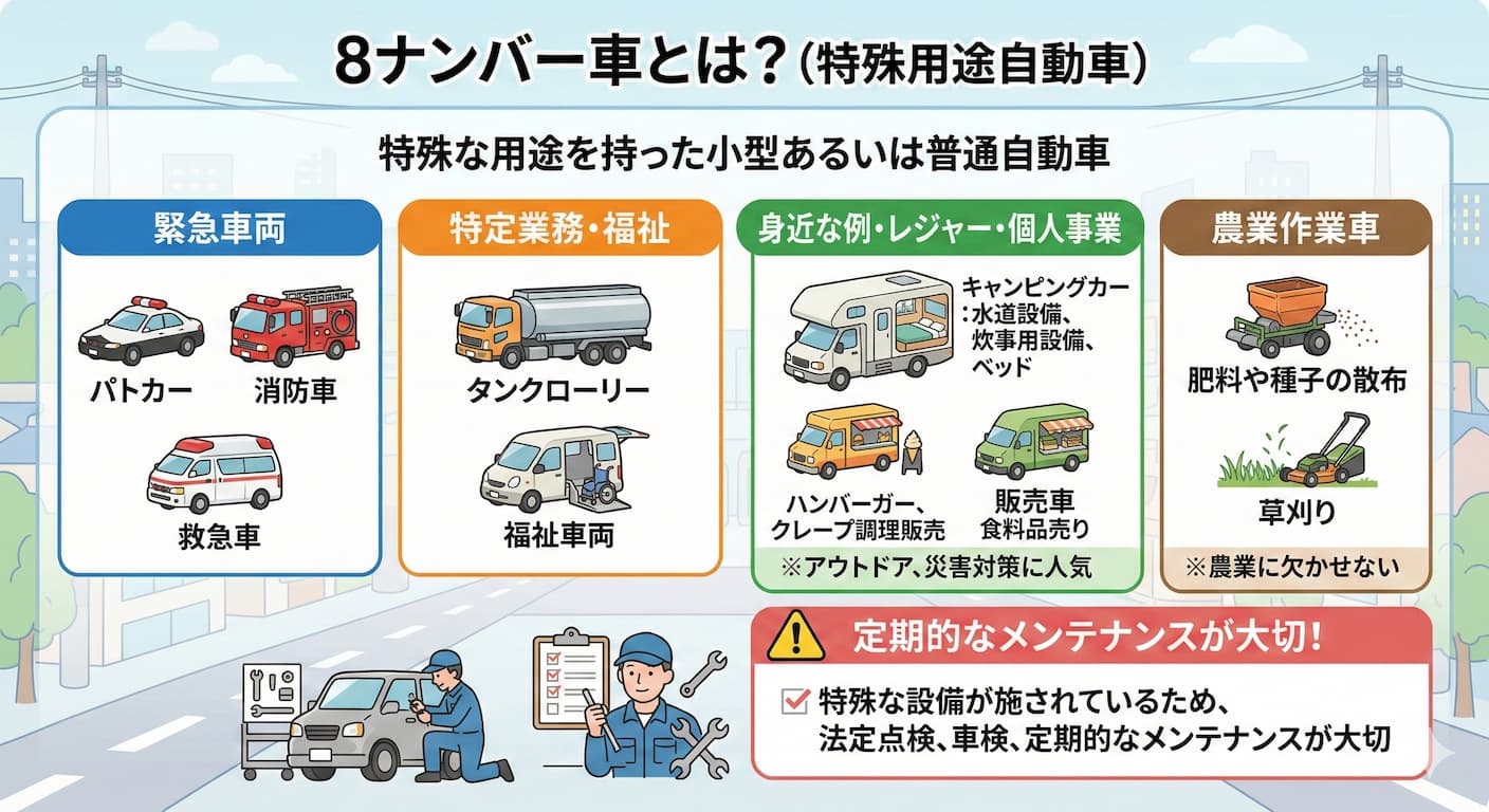 パトカーや消防車、救急車などの緊急車両に割り当てられているのが8ナンバーです。緊急車両だけでなく、郵便車や採血車、現金輸送車といった特殊な車両のほか、キャンピングカーもこの中に分類されています。