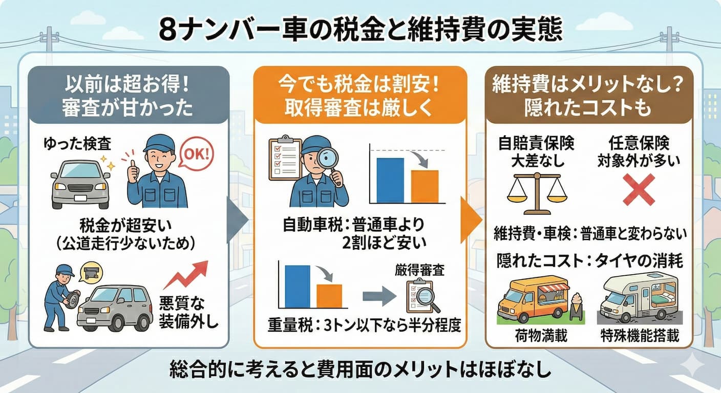 分類番号は用途を分けるために存在します。分類番号が違うと、車検の有効期限や税金にも差が生じます。